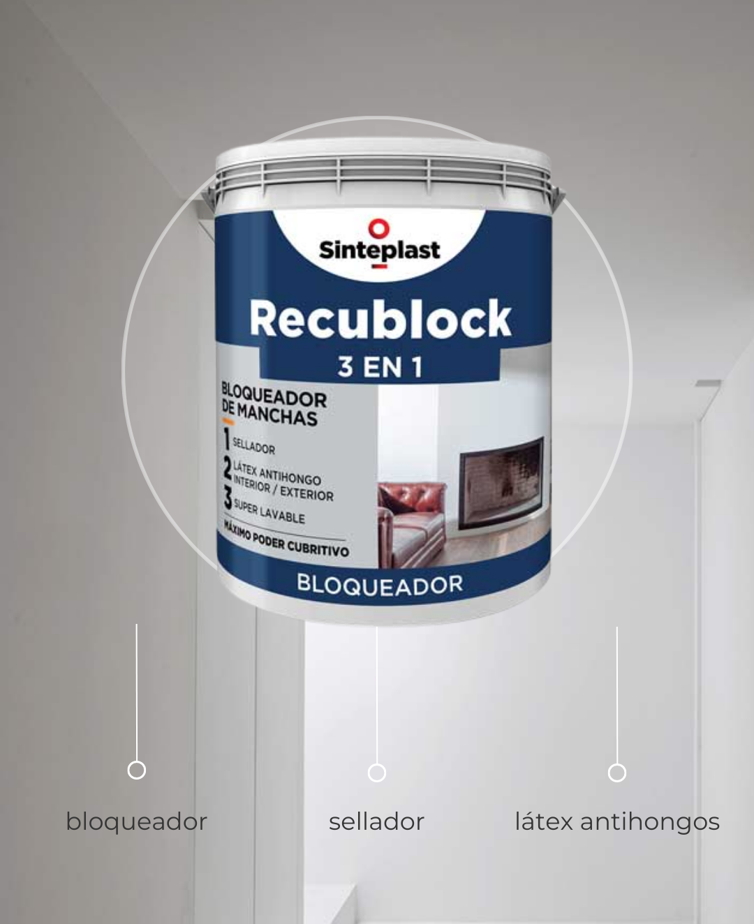 Sellador, bloqueador de manchas y pintura de terminación Premium, 100% acrílica. Presenta excelente adherencia sobre distintos sustratos, de gran cubritivo, óptimo acabado y muy lavable, permite lograr terminaciones de alta calidad y mantener por mucho más tiempo el aspecto de recién pintado. Además, Recublock 3 en 1 posee un eficaz fungicida que evita el desarrollo de hongos en su superficie.